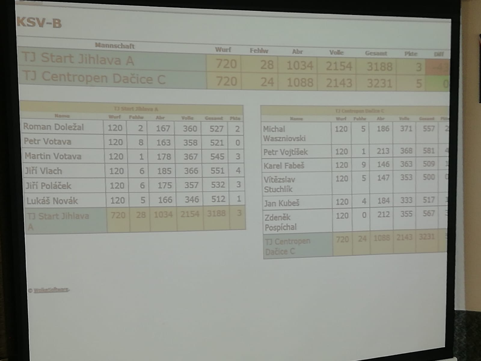 Konec dobrý, všechno dobré, z Jihlavy vezeme 2 body - 5:3, +43 kuželek. Děkujeme Peťovi, Vaťákovi a Zdendovi za perfektní pomoc a rádi je zase někdy uvidíme ;-)